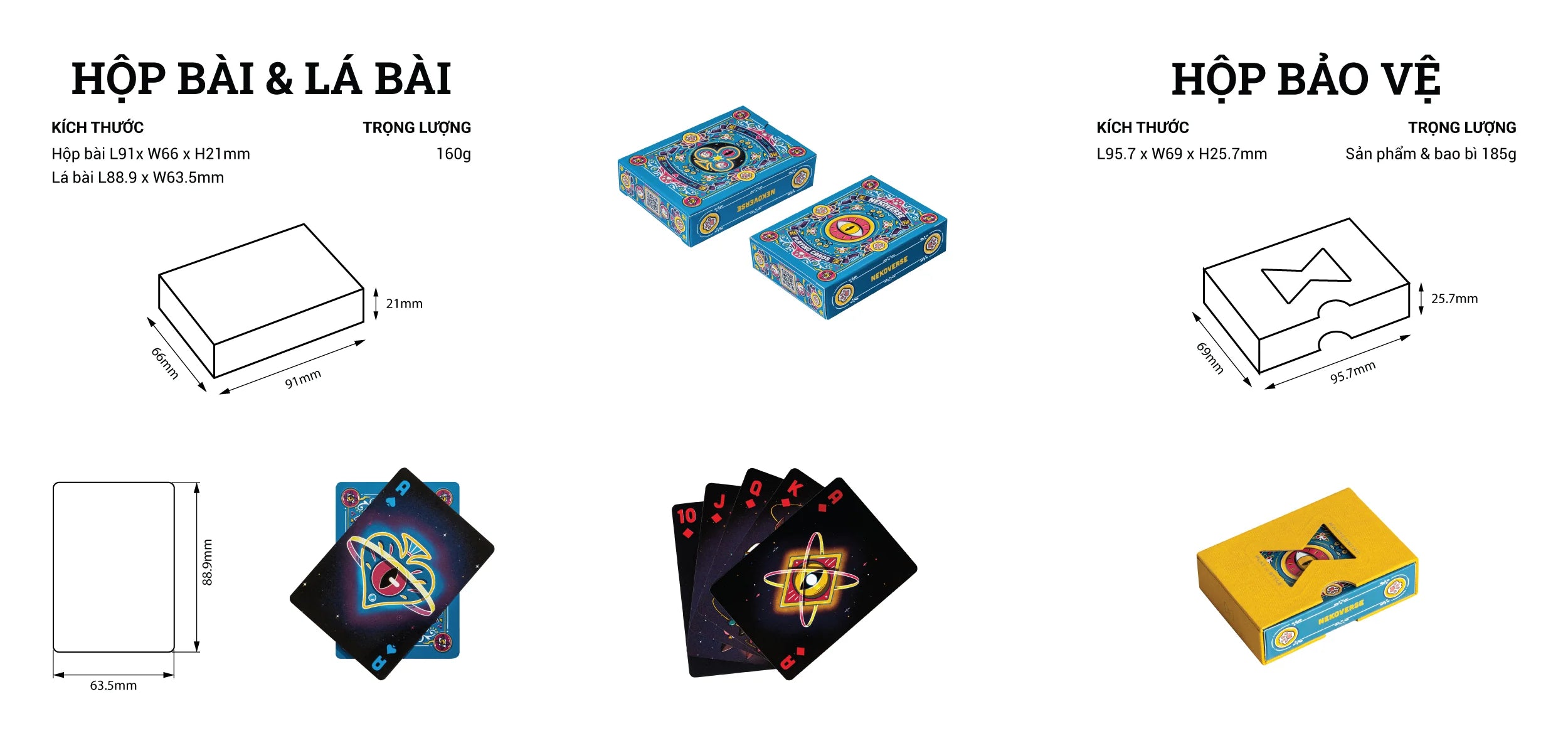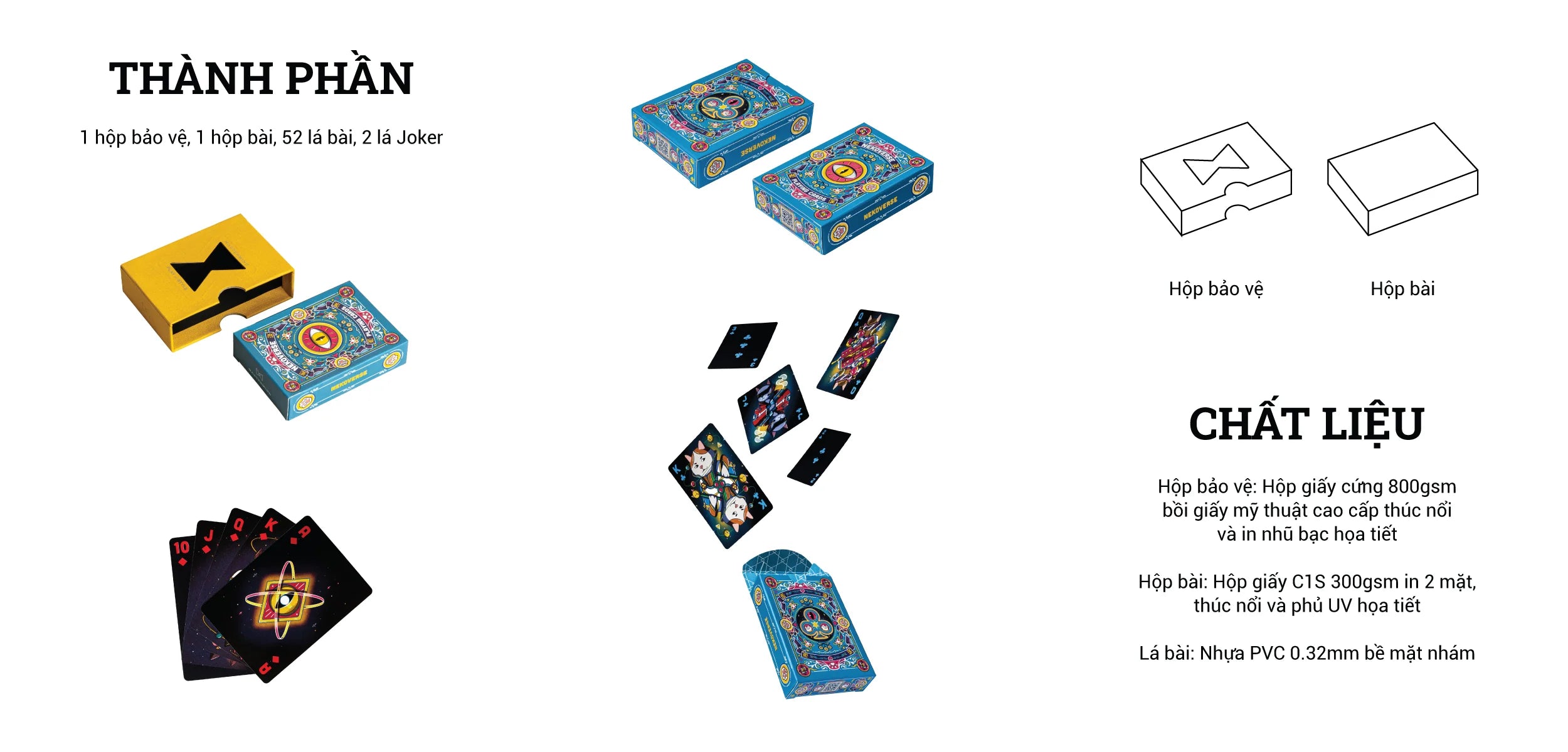 - Hộp bài: giấy C1S 300gsm in 2 mặt, thúc nổi và ép kim hologram.