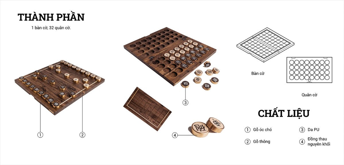 Được chế tác từ đồng thau và da PU cao cấp, mang đến sự hoà quyện tinh tế giữa vẻ đẹp sang trọng và độ bền lâu dài. Trọng lượng đầm tay của đồng thau tạo hiệu ứng âm thanh độc đáo cho mọi nước cờ, góp phần làm tăng thêm cảm giác thích thú trong một trải nghiệm chơi trọn vẹn.