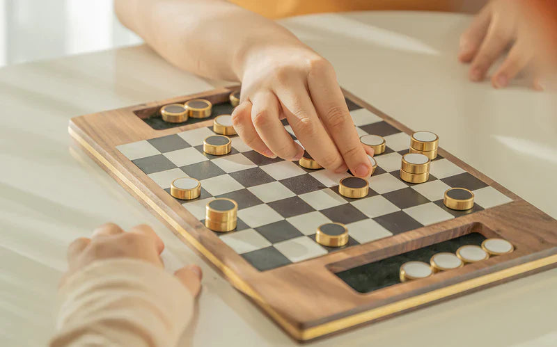 Được làm từ gỗ óc chó bền vững, bàn cờ được lắp ráp thủ công và hoàn thiện bằng da mang thương hiệu của chúng tôi, tạo nên một nét sang trọng đặc biệt. Những quân cờ bằng đồng rắn, được trang trí với màu đen và trắng cổ điển, mang lại cảm giác chắc chắn khi cầm nắm. Với các quân cờ từ tính dễ dàng xếp chồng và các rãnh được thiết kế để lưu trữ, bộ cờ này kết hợp sự tinh tế với tính năng tiện dụng.