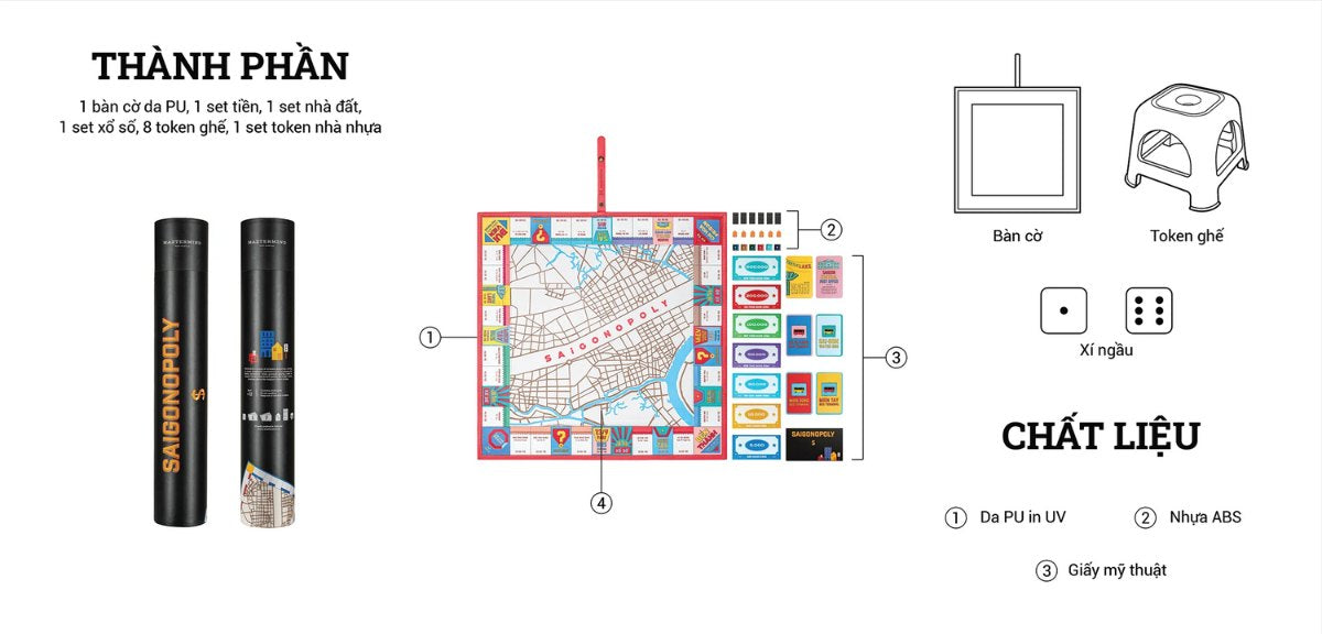 Thành phần: 1 bàn cờ da, 8 token ghế nhựa, 1 set nhà đất, 1 set cơ hội và khí vận, 1 set token nhà nhựa, 1 bộ tiền và 02 xúc xắc (xí ngầu).