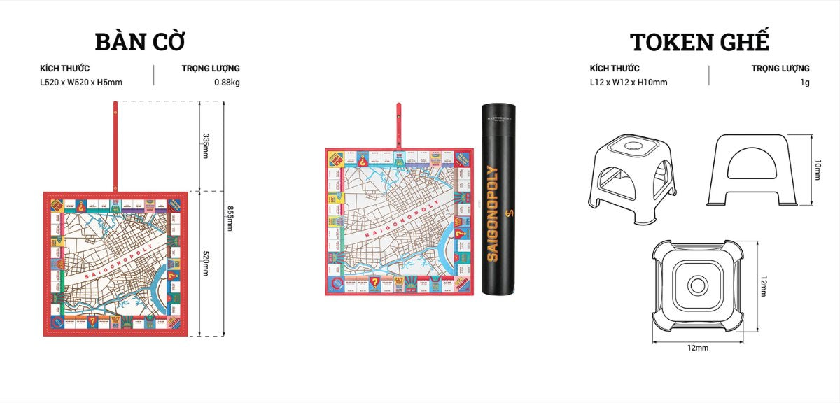 Làm từ nhựa PVC, các token sắc màu được lấy cảm hứng từ hình ảnh những chiếc ghế đẩu vỉa hè quen thuộc của Việt Nam. Thiết kế nhỏ gọn và tinh tế đòi hỏi quá trình đúc khuôn và mài cạnh tỉ mỉ, đảm bảo tính an toàn và thoải mái xuyên suốt quá trình chơi.