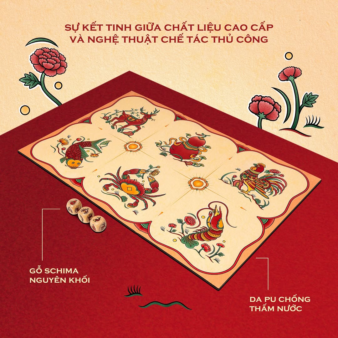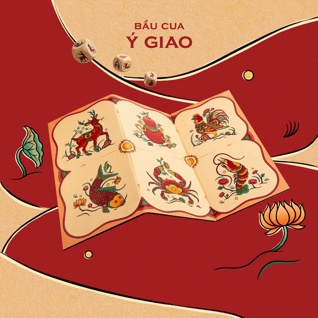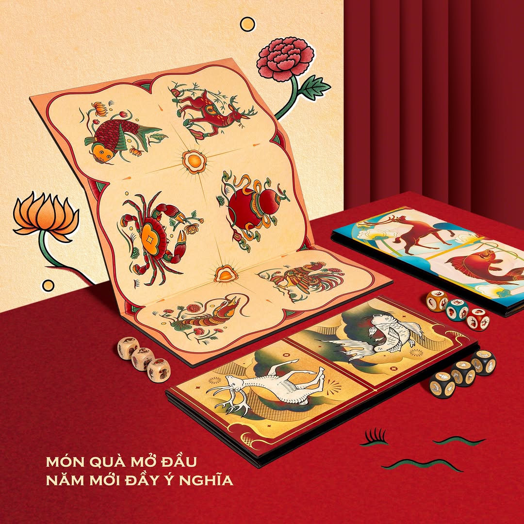 Lấy cảm hứng từ tranh dân gian Đông Hồ, bộ Bầu Cua Ý Giao hòa quyện tinh tế giữa Tết xưa và nay. Sự giao thoa này kết nối không khí Tết hiện đại với những giá trị truyền thống, tái hiện sắc màu rực rỡ và nét vẽ tinh tế của tranh Đông Hồ—biểu tượng cho những ước nguyện đầu năm.