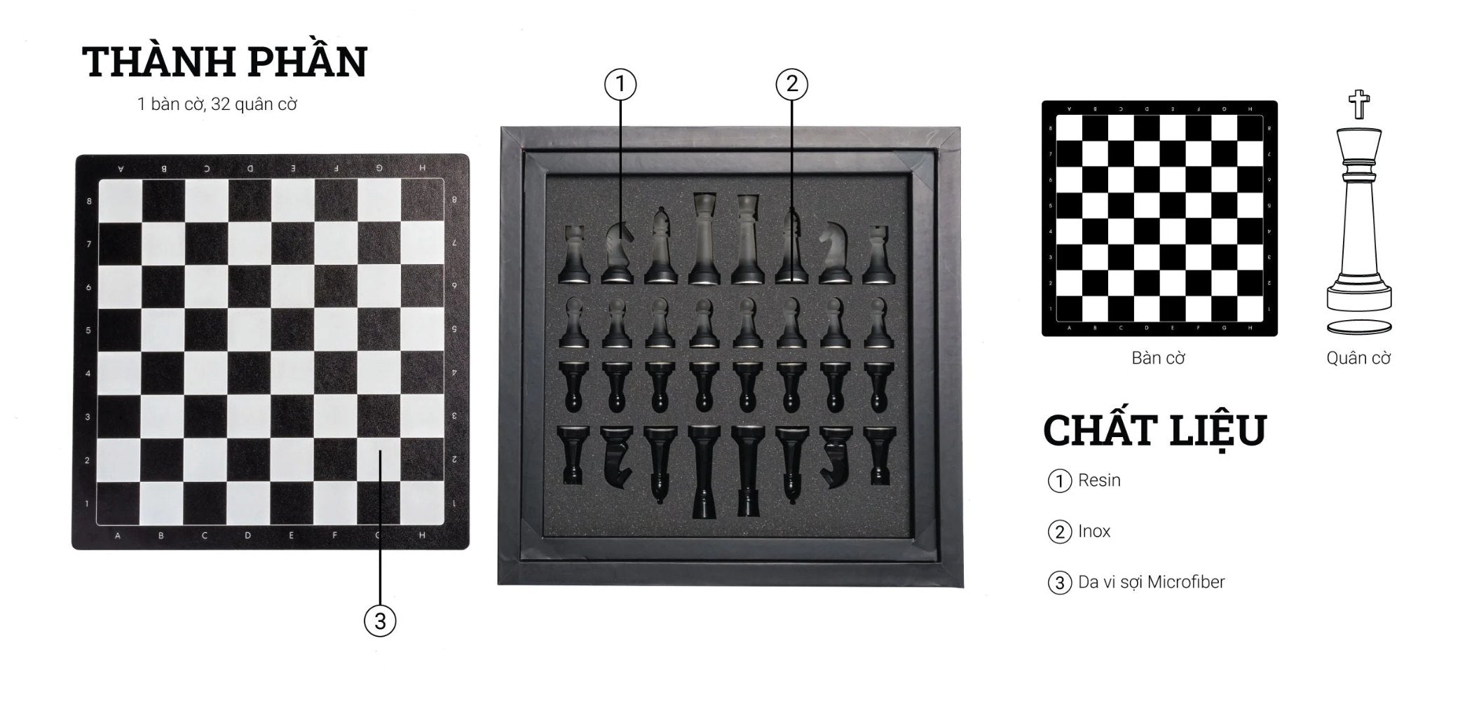 Được làm từ resin với phần đế bằng thép không gỉ, sự kết hợp này mang đến cảm giác cầm êm nhẹ và sự tinh tế cho từng nước cờ chiến thuật. Sử dụng kỹ thuật tạo khuôn bóng và nhám, kết hợp cùng phương pháp đánh bóng và chà nhám, cho ra hai lớp hoàn thiện tương phản giữa các quân cờ, tạo nên tính thẩm mỹ độc đáo cho sản phẩm.